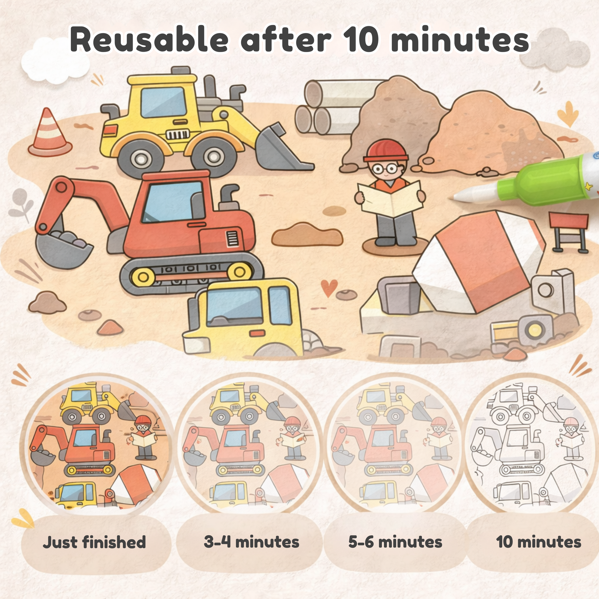 Simply fill the pen with water and watch vibrant colors appear like magic. Once it dries (in about 5–10 minutes), the page resets — ready to be painted again and again.
